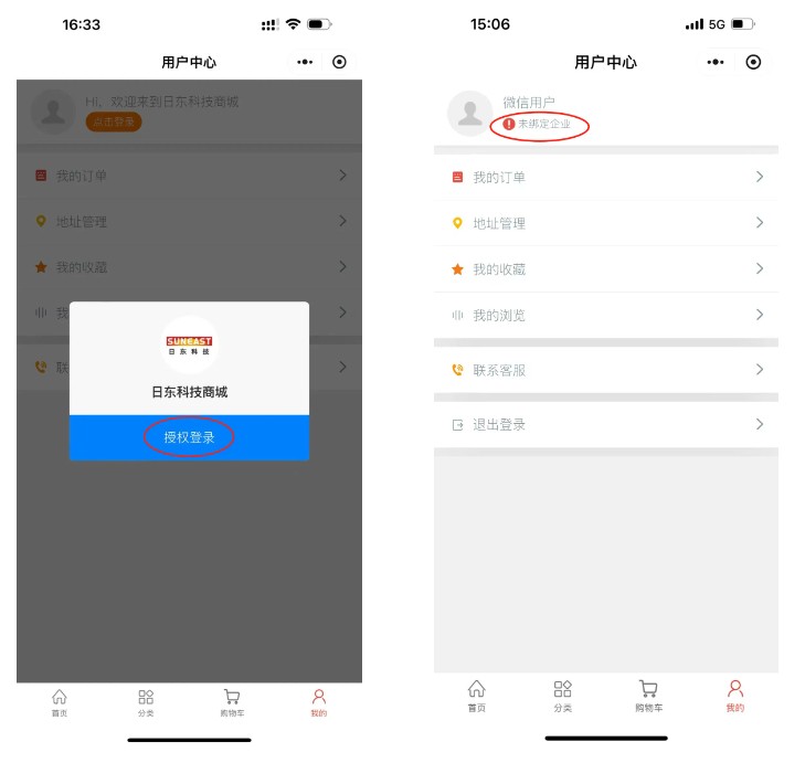 進入首頁需先點擊-我的-點擊登錄-授權登錄 –綁定企業,完善企業資料。詳細操作如下圖所示: