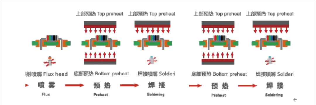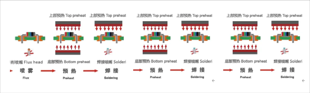 ③ 噴霧+預(yù)熱+焊接+預(yù)熱+焊接+預(yù)熱+焊接