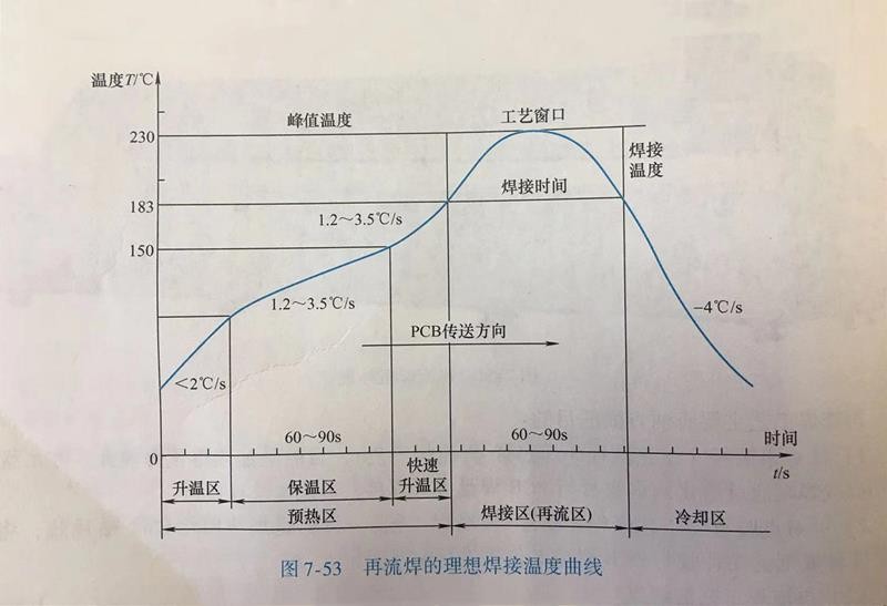 (3) 回流焊工藝的基本過(guò)程:一般的,一個(gè)完整的回流焊工藝基本流程需要經(jīng)過(guò)基板傳送、預(yù)熱、保溫、回流、冷卻等工序。