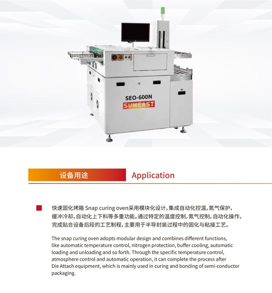 快速固化烤箱SE0-600N采用模塊化設(shè)計(jì),集成自動(dòng)化控溫,氮?dú)獗Wo(hù),緩沖冷卻,自動(dòng)化上下料等多重功能。通過特定的溫度控制,氮?dú)饪刂疲詣?dòng)化操作,完成貼合設(shè)備后段的工藝制程,主要用于半導(dǎo)封裝過程中的固化與粘接工藝。